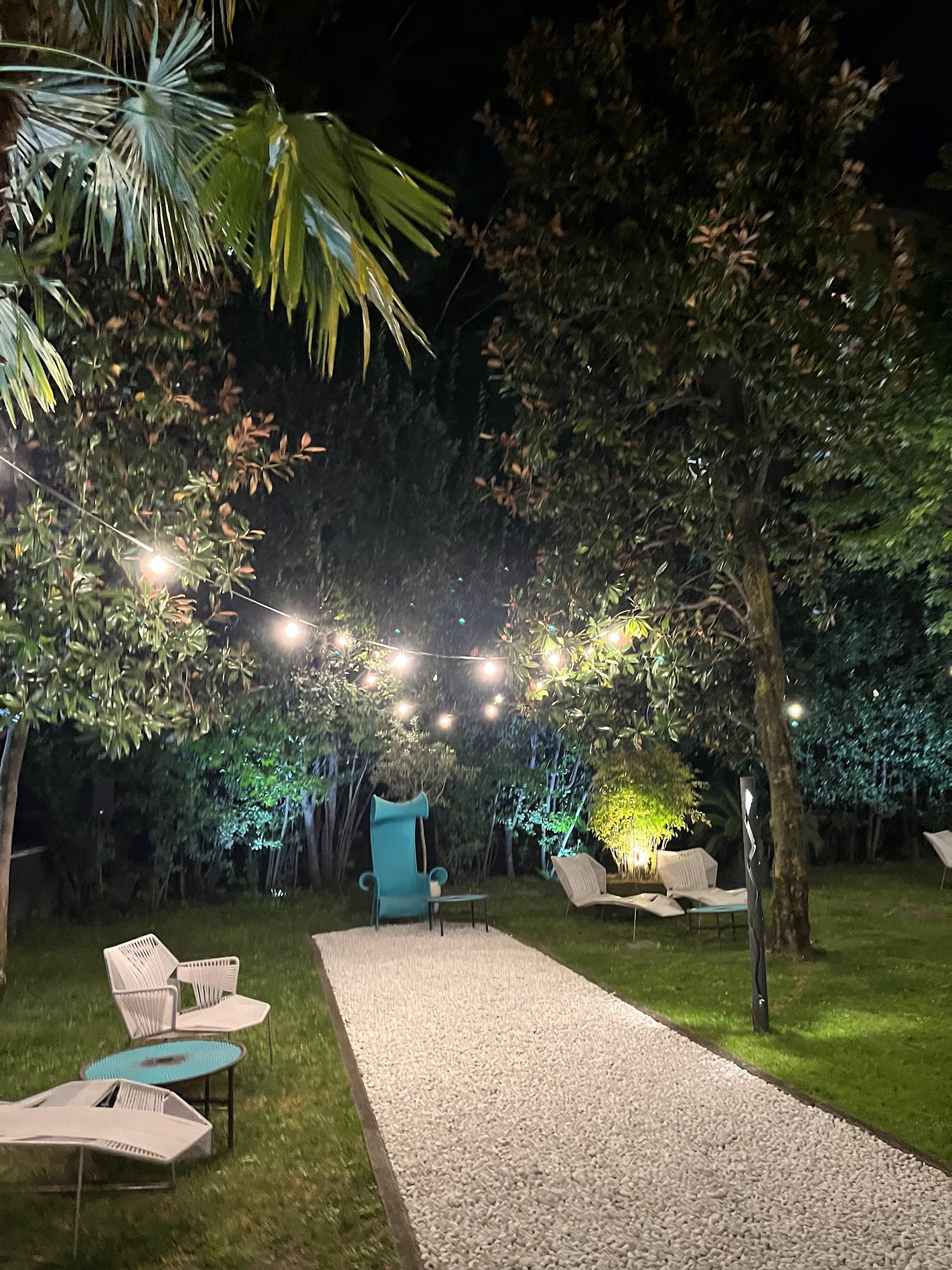 낮에도 예뻤지만 호텔 뒷쪽에는 이렇게 벤치들이 많은 잔디밭이 있었다. 이마저도 여기를 앉아 있는 사람이 없어서 방에 잠시 들어갔다가 나와서 몇시간 동안 앉아서 이야기했다. 날씨도 시원하고 물 흐르는 소리에 이 공간에 아무도 없다보니 너무 평화로웠다.