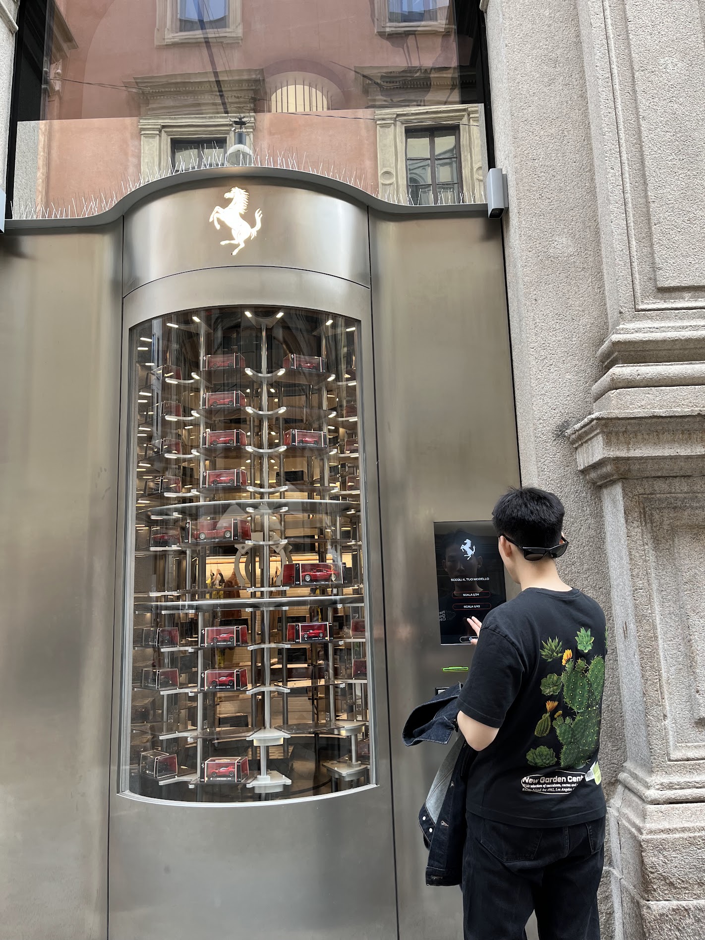 여긴 페라리 스토어, 야외에 다이캐스트 자판기가 있었는데 너무 멋있어서 한번 만지작하게 됐다.