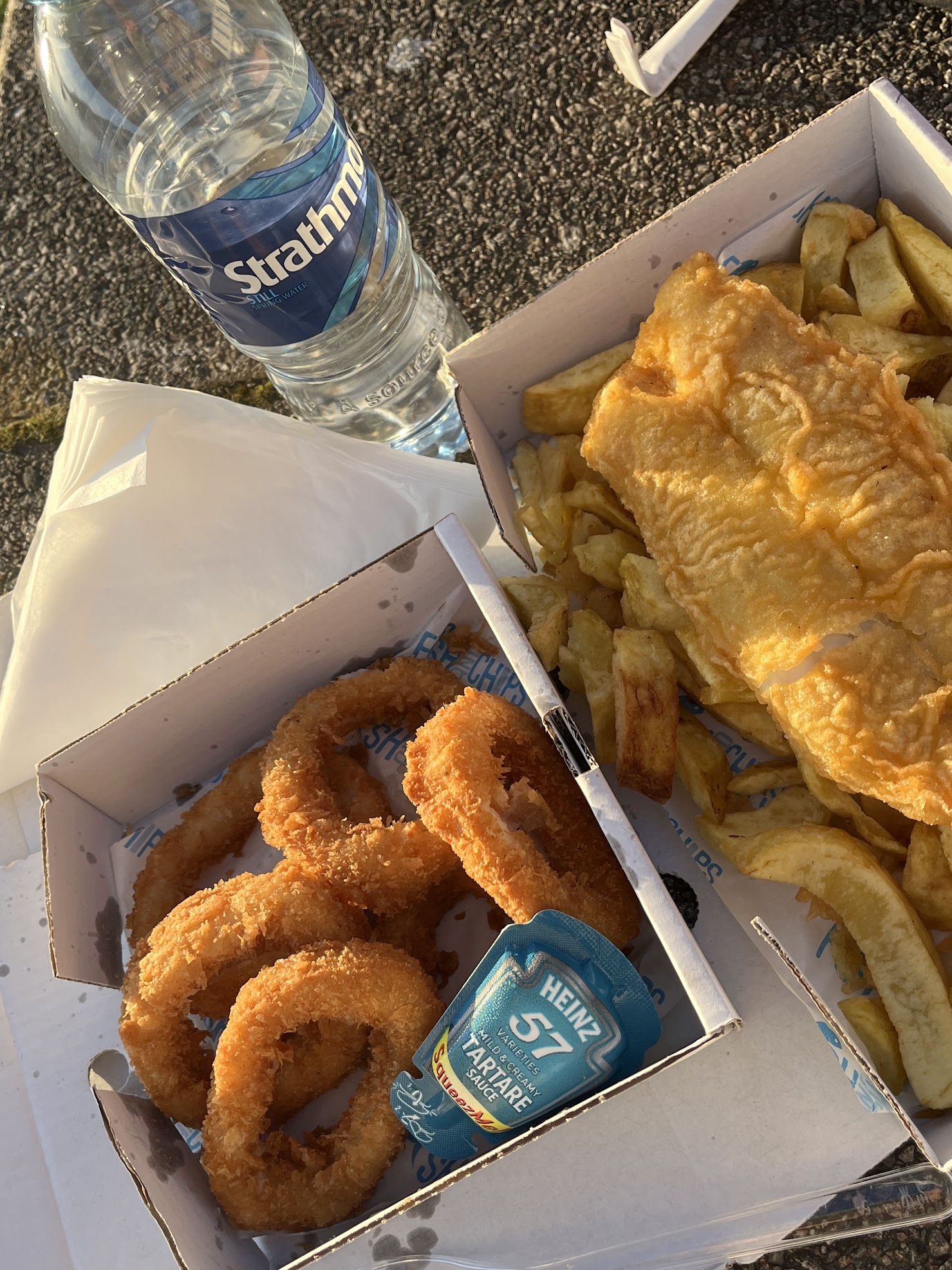 항구 앞에 둑에 걸터앉아서 먹었던 피쉬앤칩스랑 오징어튀김, 오징어 튀김이 맛있었다.
