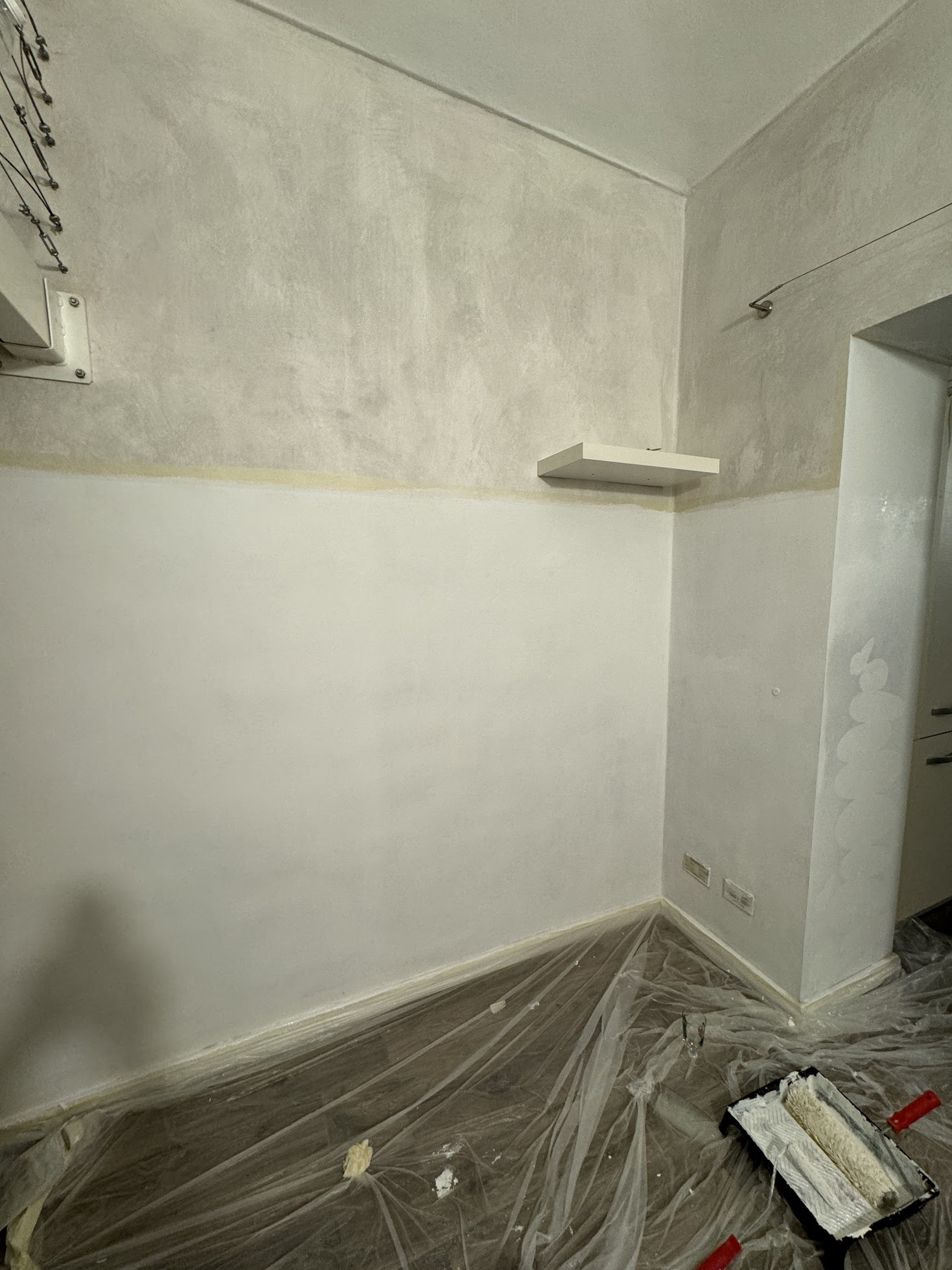 롤러는 친구한테 빌리고 페인트랑 플라스틱 판떼기와 마스킹테이프를 사서 발랐다. 수성 페인트라 냄새가 정말 안나서 굉장히 만족스러움. 프로젝터를 할 생각으로 프로젝터 크기만큼의 높이만 페인트칠을 했는데 꽤 만족스러움.
